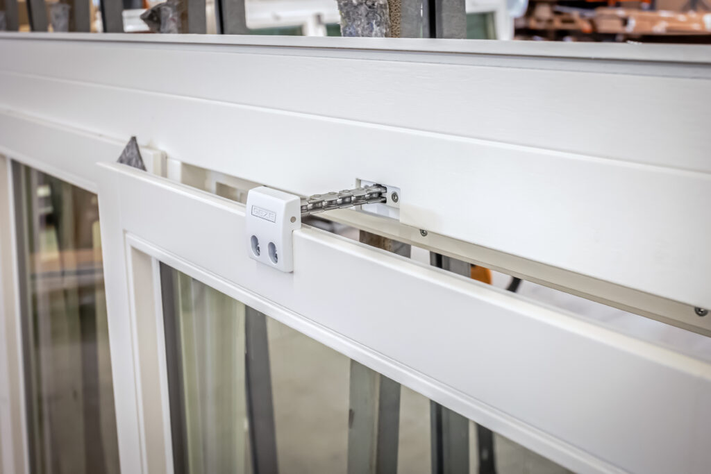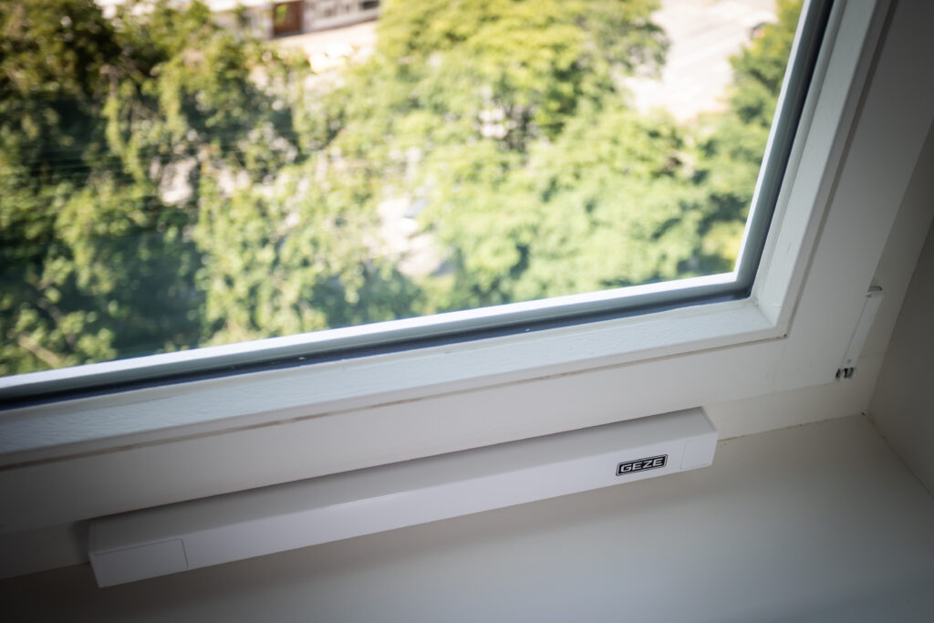 Für die äußeren Fensterflügel wurden GEZE Slimchain Antriebe in Kombination mit dem Verriegelungsantrieb Power lock installiert,